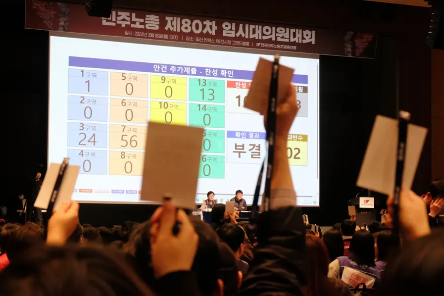 2024년 3월 민주노총 대의원대회 992명 중 280명으로, 과반에 217명 부족 “한반도 비핵화 견지” 수정동의안이 부결되었다.