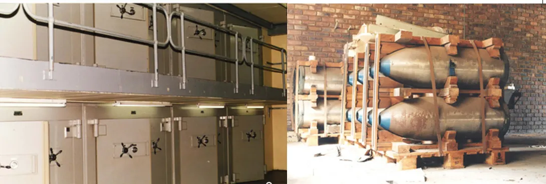남아공의 핵탄두 관련 장치(왼쪽)와 케이스(오른쪽) 남아공의 핵무기는 완전히 조립되어 배치되어 있는 상태가 아니었다.