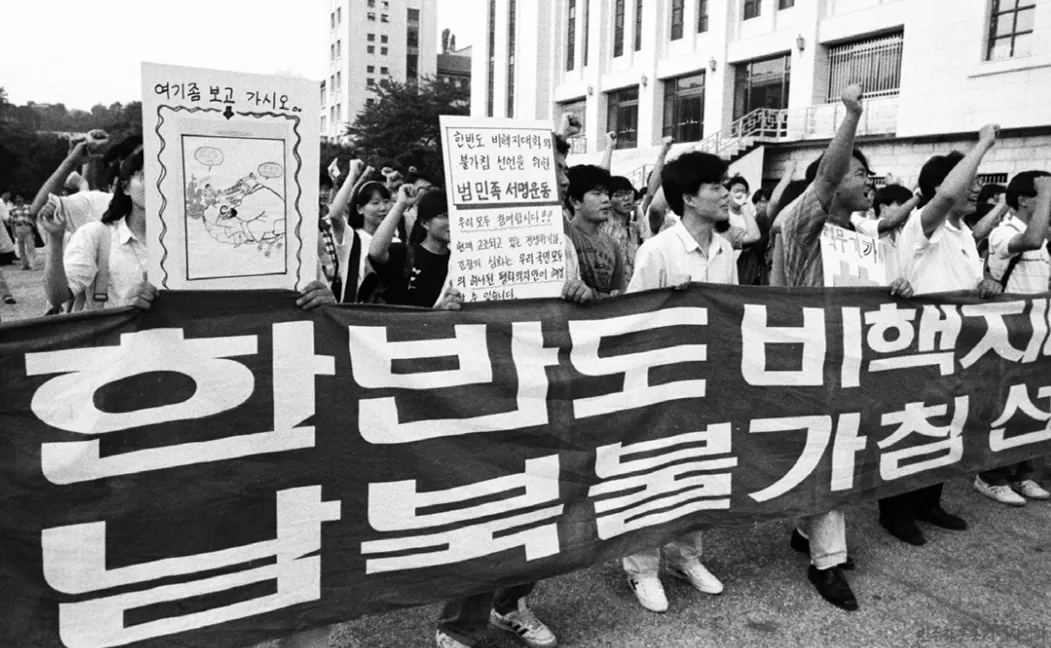 1991년 8월, '한반도 비핵지대화와 남북불가침선언을 위한 범민족 서명운동' 발족식을 마치고 각종 현수막과 피켓을 들고 행진하는 참가자들.