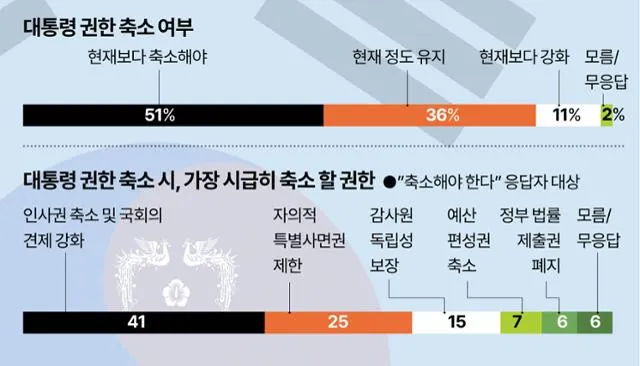 한국일보·한국리서치가 실시한 신년여론조사 결과, 1,000명 응답자 중 51%는 '대통령 권한 축소'에 찬성했다. /한국일보