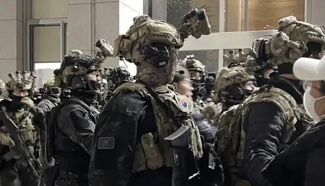 12월 4일 새벽, 국회의사당 진입을 시도하는 무장군인. 연합뉴스.
