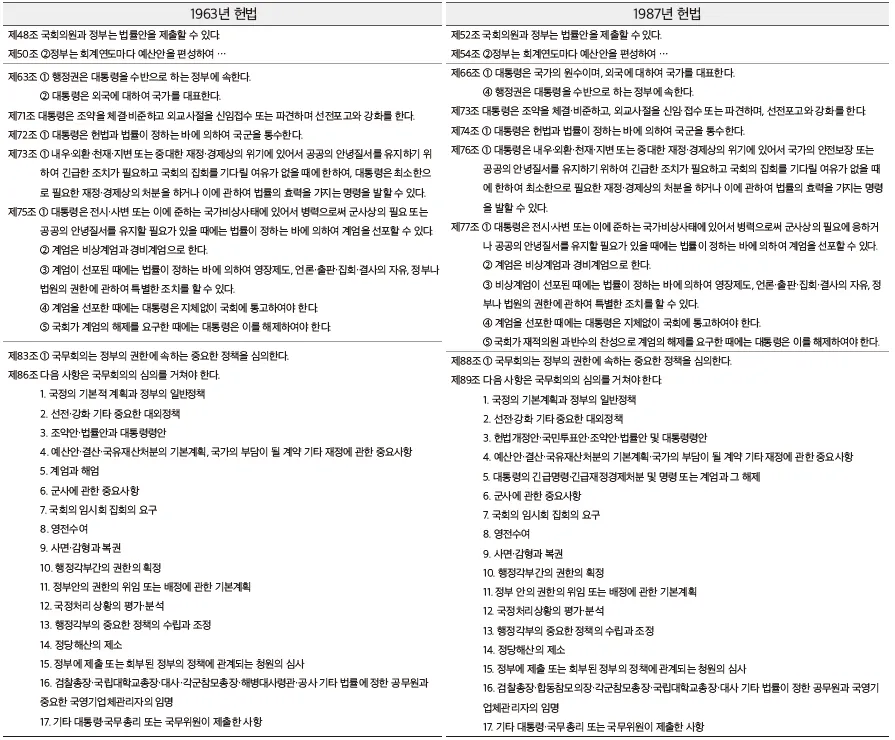 1963년 제3공화국 헌법과 현행 1987년 헌법에서 대통령과 국무회의와 관련한 조항을 비교해보면, 이 점을 명확히 알 수 있다. 위의 표를 살펴보면, 조항이 거의 비슷한 것을 확인할 수 있다. 이런 유사함은 김영삼과 김대중이 민주화를 유신 이전으로의 복귀로 사고했고, 대통령이 될 수 있다는 생각에 권한과 관련하여 숙고하며 논의하지 못했다는 증언 혹은 추론을 뒷받침한다.