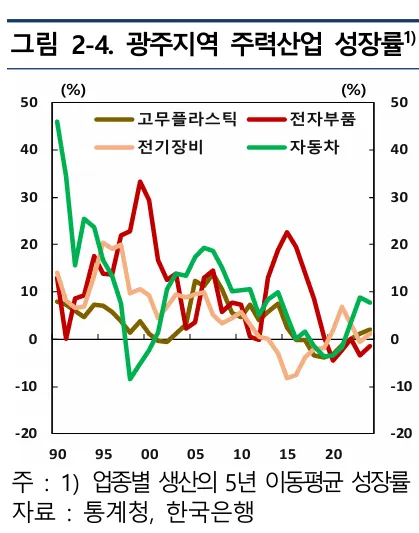 한편, 전남과 달리 광주는 2025년 자동차·전기·전자 중심으로 회복세를 이어갔다. 그러나 생산지수를 보면 그 외 업종의 경우 하락세를 면치 못하고 있다. 자동차와 전자부품 또한 마냥 낙관적이라고 할 수 없는데, 지표는 전년 동기 대비를 의미하고 있기 때문이다. 2025년에 지표가 좋다는 것이 절대적 수치라기보다는 2024년에 비해 상대적으로 좋다는 의미이며, 정확한 업황을 보려면 장기간의 추세를 확인하는 것이 필요하다.