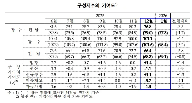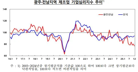 광주·전남 지역의 기업심리지수가 전국 평균과 큰 격차가 나고 있다. 그 속내는 좀 더 심각한데, 광주가 100포인트를 넘어 평균을 웃도는 반면, 전남의 기업 심리는 2025년 7월부터 60포인트 대로, 코로나19 당시 수준까지 떨어진 것이 이유이기 때문이다. 근 10년 동안 손꼽히는 경기 위축이다.