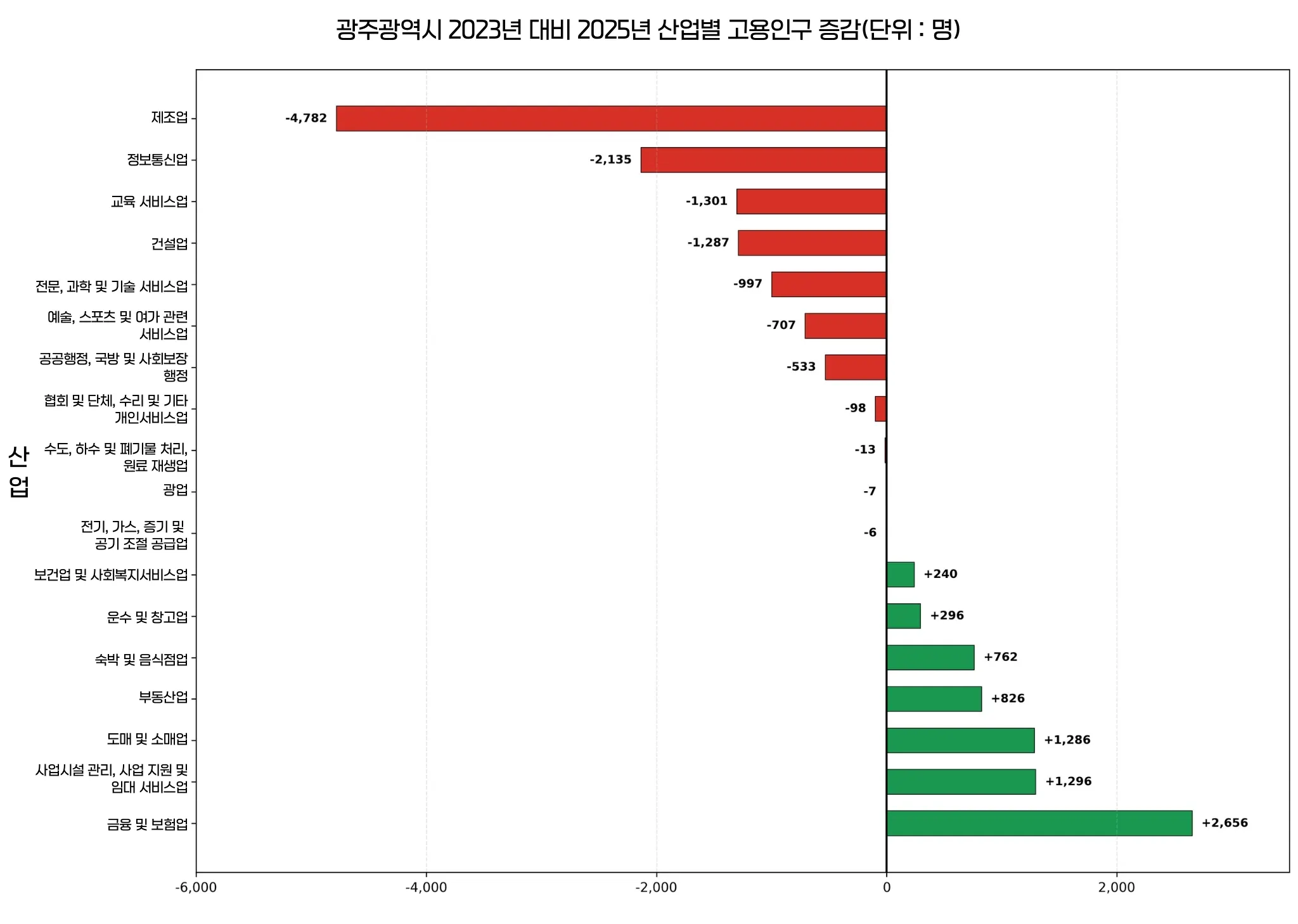 근 30여년 간의 주력산업 성장률을 보면 제조업 전반의 하향세를 부정하기는 어렵다고 할 수 있다. 더욱이 산업 현장의 자동화로 산업의 성장이 곧 고용의 증대라고 보기도 어렵다. 그 결과 2023년 11월 대비 2025년 11월 광주의 산업별 고용현황을 보면, 총 -4,507명으로 역성장을 기록했다.