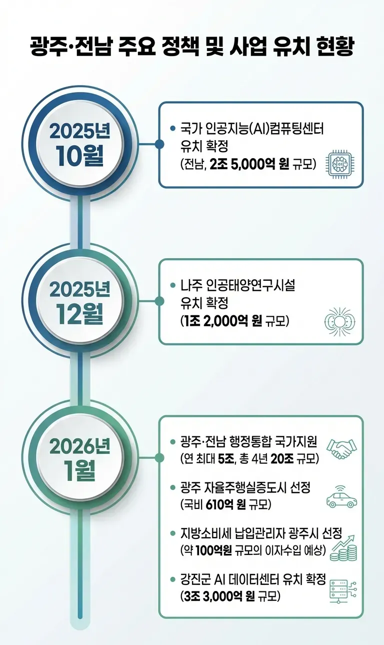 2025년 10월 국가인공지능(AI)컴퓨팅 센터 유치가 전남으로 확정되었고, 그 이후 12월 인공태양연구시설 유치가 나주로 확정되었다. 그리고 갑작스레 1월 2일 광주와 전남이 행정 통합을 선언하며, 관련 예산 지원 약속 뿐만 아니라 자율주행실증도시 선정 등 연달아 국가 정책적 지원이 광주와 전남에 쏟아졌다. 더불어 전라남도는 민간 기업의 금융 투자를 기반으로 하는 강진군 AI 데이터센터를 유치했다. 2025년 10월부터 2026년 까지 쏟아진 정책 사업의 총 규모는 약 27조에 달한다.