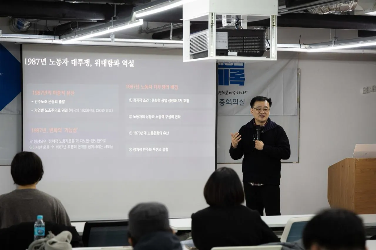 "87년 노동자 대투쟁의 결과는 위대하긴 하지만, 그 이후 노동운동이 발전한 경로를 딱 고정한 측면이 있습니다. 기업별 노조 체제가 공고화된 것도 87년 투쟁의 결과였고, 대기업과 공공부문 노동조합 중심으로 만들어진 것도 87년의 유산이라고 할 수 있습니다."