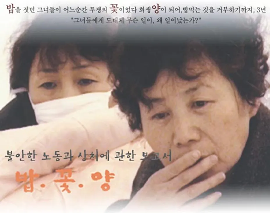 다큐멘터리 <밥·꽃·양> (2002) 1998년 IMF 외환위기 속에서 현대자동차 정리해고 반대 투쟁 중 해고된 144명의 식당 여성 노동자들의 3년간의 투쟁 기록. 투쟁의 '꽃'이었다가 정리해고의 희생 '양'이 되어버린 '밥' 하는 여성 노동자들의 이야기를 담은 다큐멘터리.