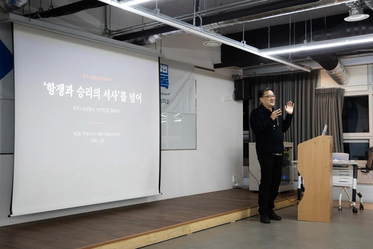 2026년 1월 22일 목요일 저녁 7시 광주 전일빌딩 중회의실에서 『투쟁의 역사, 성찰의 기록: 한국노동운동사 1987~2025』(벽너머, 2025) 출간 기념 저자 초청 강연회가 열렸다. 사회진보연대 광주전남지부, 광주전남노동안전보건지킴이(준)의 공동주최로 저자 박준형 공공운수노조 부설 교육센터 ‘움’ 사무국장을 초청하여 개최한 이 날 강연회에는 40여 명의 참석자들이 자리를 가득 채웠다.